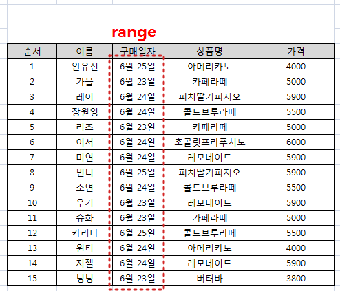 ① range 입력(특정하고 싶은 조건 범위 선택하기)