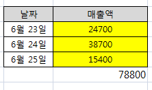 내가 넣은 sumif 함수로 구한 일자별 매출액의 합계가 78,800원이 나옵니다.