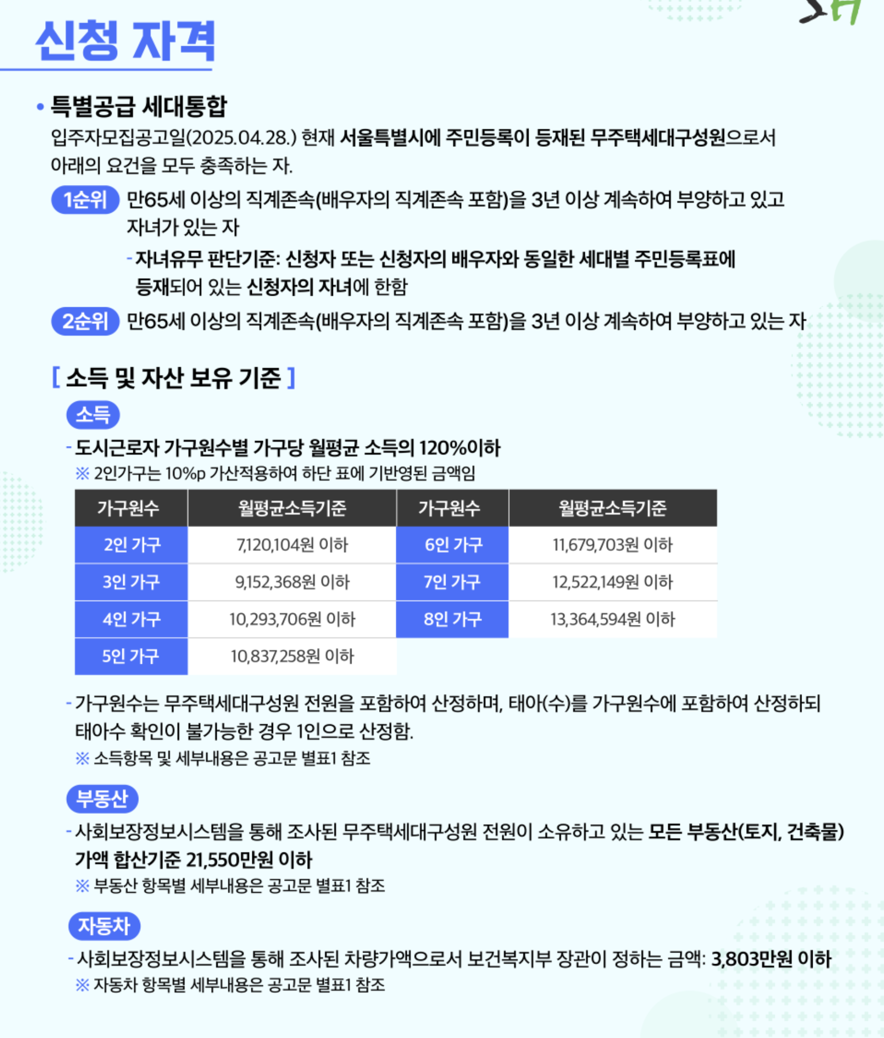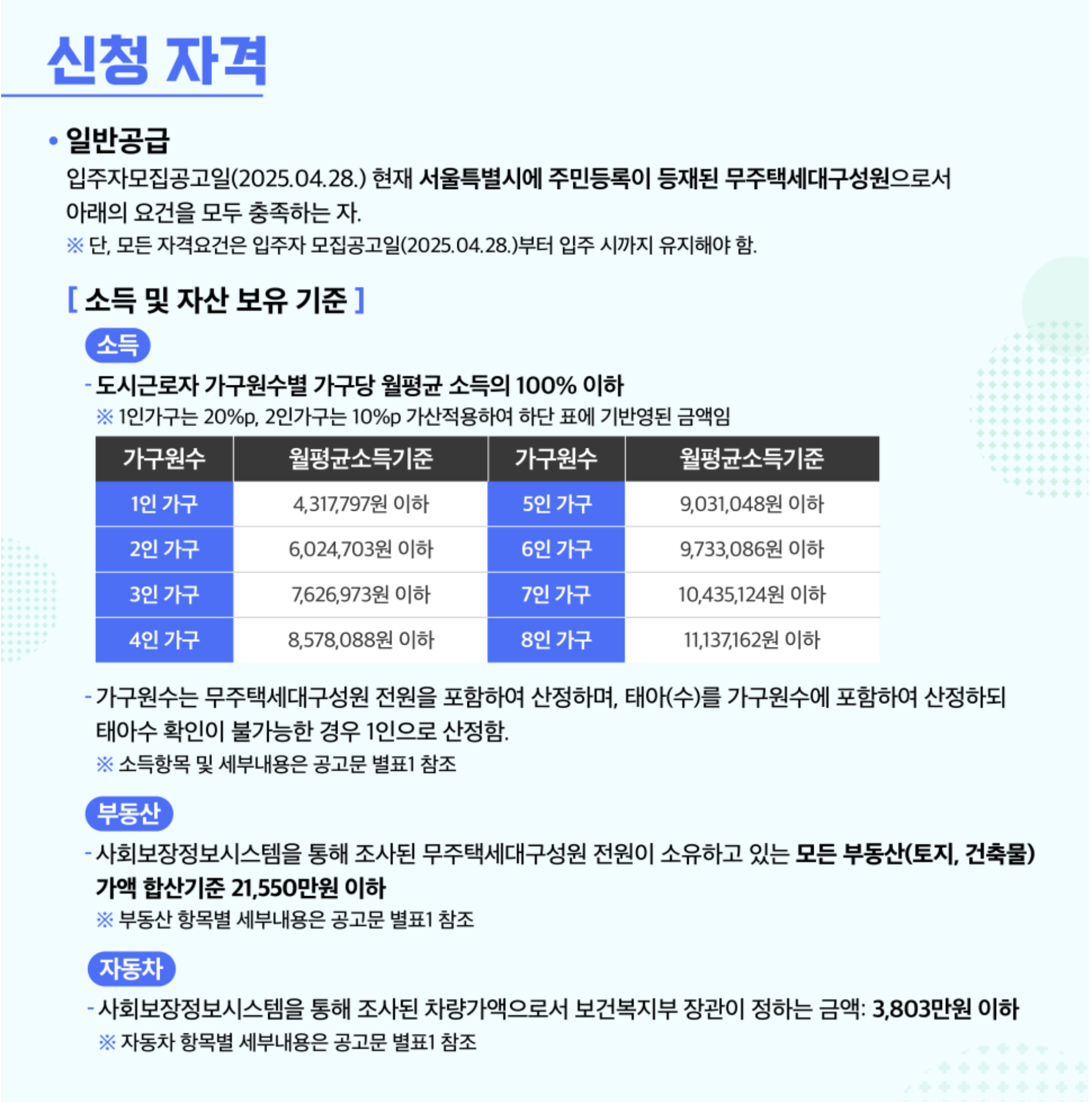 총 4,000호를 모집하며, 일반공급 3,600호, 특별공급 400호(신혼부부, 세대통합)가 포함되어 있습니다. 모집공고일(2025.04.28) 기준 서울시에 거주하는 무주택 세대구성원이면서, 소득과 자산 기준을 충족해야 지원할 수 있습니다.
