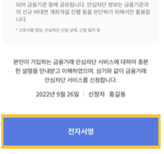 5) 안심차단 신청서 및 전자서명 화면을 확인 후 하단의 <전자서명> 누르기