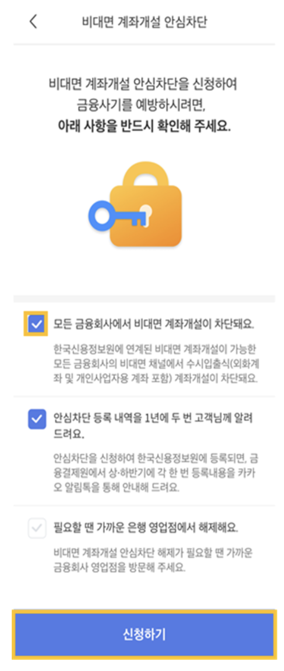 비대면으로 개설되는 은행, 증권사, 우체국 등 모든 금융권의 수시입출식 계좌를 사전에 일괄 차단할 수 있는 보안 서비스입니다.