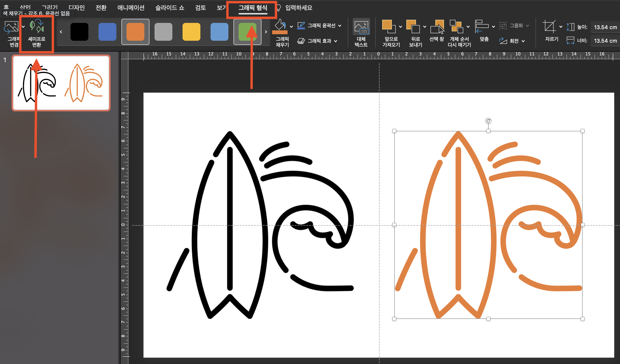 SVG 사진을 선택 후 > 상단의 [그래픽 형식] > [셰이프로 전환](윈도우의 경우 도형으로 전환) 클릭을 해주시면 됩니다.
